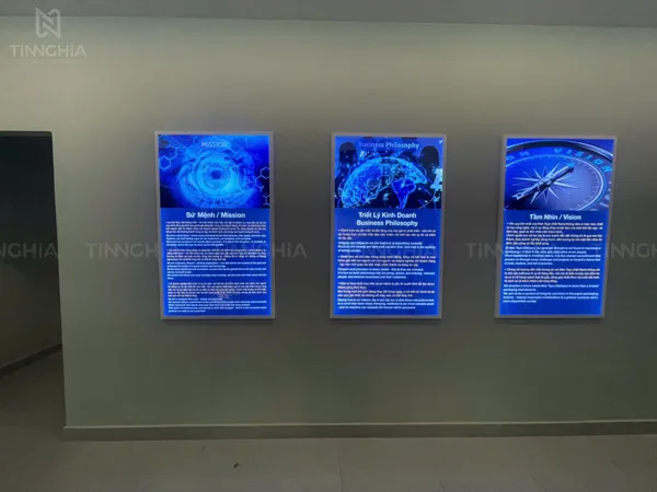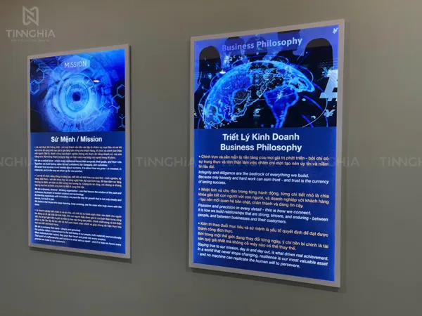 Biển Mission, Business Philosophy, Vision: Các thông điệp được in trên chất liệu backlit film hoặc tương tự, sau đó được lồng vào khung hộp đèn siêu mỏng có đèn LED chiếu sáng từ bên trong. Thiết kế này không chỉ giúp nội dung trở nên rõ ràng, sắc nét với ánh sáng đồng đều mà còn mang lại vẻ ngoài tinh tế, hiện đại, không chiếm nhiều diện tích. Đây là lựa chọn lý tưởng cho các không gian trưng bày cần thay đổi nội dung linh hoạt.