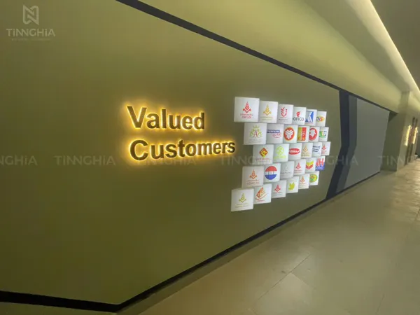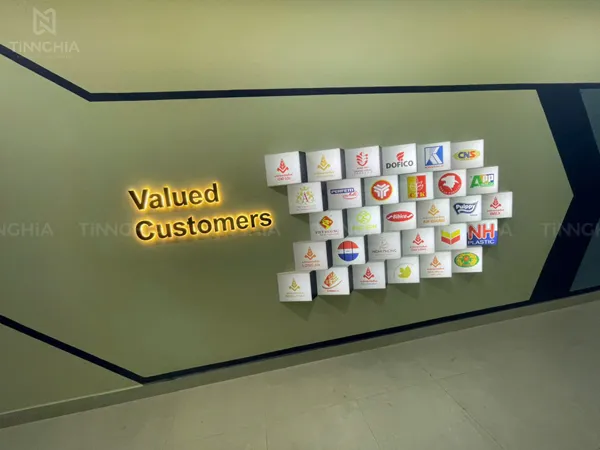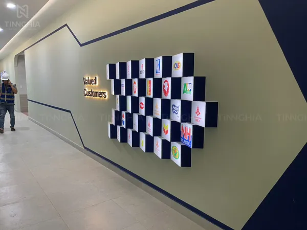 - Hiệu Ứng Ánh Sáng: Từng khối hộp đèn được chiếu sáng từ bên trong bằng LED, làm nổi bật logo và màu sắc thương hiệu của từng đối tác một cách rõ nét và đồng đều.