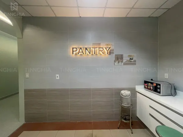 - Biển hiệu PANTRY: Chữ PANTRY được gia công bằng vật liệu bền, cao cấp, sau đó gắn hệ thống LED hắt sáng chân chữ. Ánh sáng vàng ấm từ LED tạo hiệu ứng 3D lấp lánh trên nền gạch, giúp biển hiệu này trở thành một điểm nhấn tinh tế và dễ dàng nhận diện.