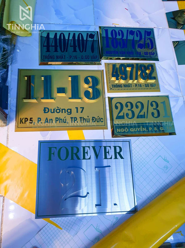 - Bảng hiệu inox vàng dập nổi: Cũng tương tự như loại bảng hiệu inox ăn mòn, nhưng chữ được dập nổi lên tạo hiệu ứng 3D, thích hợp làm bảng hiệu nhỏ như bảng tên văn phòng công ty, biển số nhà...